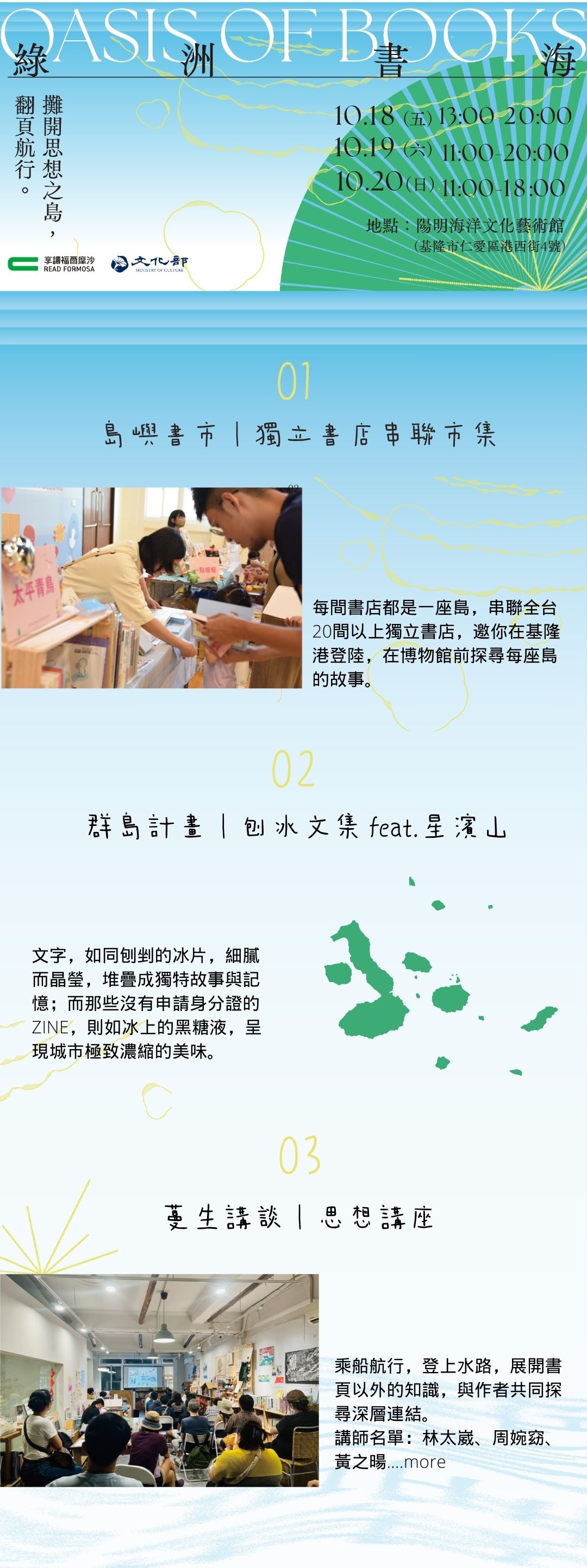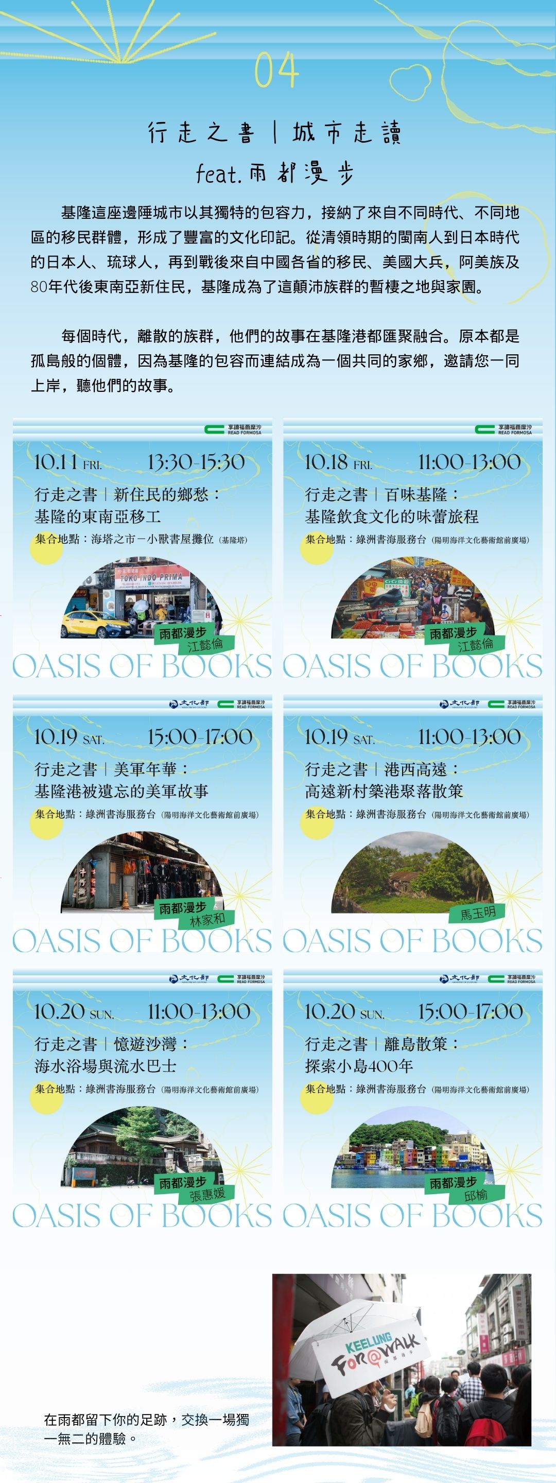 基隆,在台灣最北端。擁有豐富的海洋文化和歷史背景,成為台灣的重要門戶,這座充滿故事與傳奇的城市,正是我們綠洲書海的起點與核心。